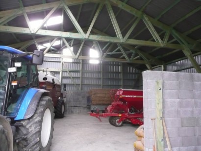 Die Halle dient als Unterstellmöglichkeit für landwirtschaftliche Fahrzeuge und Geräte. Das Unterstellen verhindert die schnelle Alterung, welche beim Abstellen unter freiem Himmel stattfindet. Die Halle hat die Maße l/b/h 20,0 x 15,0 x 5,0m. Sie hat 2 Schiebetore 5,0 x 4,50m, eine Stb-Sohlplatte und 2,0m hohe Schüttwände aus Schalungssteinen. Die Halle wurde als Holzhalle realisiert weil die Kosten bei ca. 30% günstiger als die einer Stahlhalle waren.